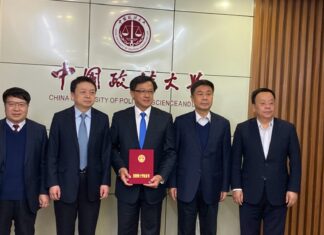 何君尧(中)与中国政法大学相关负责人的合影。何君尧获得中国政法大学名誉博士学位。(微博@何君堯JuniusHo )