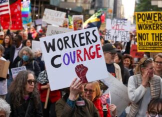 全球數千人週四參加五一國際勞動節工會示威活動,...