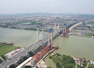 (粵港澳大灣區)深江鐵路跨磨刀門水道主橋首個主塔封頂