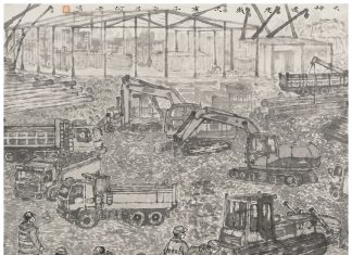 《火神速度》:此画表现火神医院的建设,作者用水墨画形式再现中国人民抗击疫情的速度。
