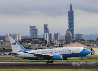美衛生部長率訪問團抵達台北 行政專機星條旗象徵高規格