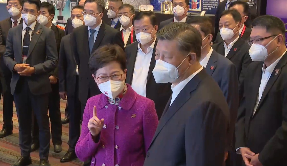 習近平與夫人彭麗媛以及中央辦公廳主任丁薛祥、中央軍委副主席許其亮、全國人大副委員長沈躍躍、國務委員兼外長王毅、全國政協副主席兼國務院港澳辦主任夏寶龍等5名隨行領導人,在高鐵西九龍站乘坐專列返回內地。