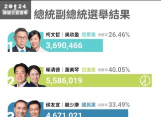 2024台湾大选开票结果出炉,由民进党候选人赖清德、萧美琴胜出得票558万票、得票率40.05%;另外两组候选人,国民党侯友宜、赵少康则以得票数467万票、得票率33.4...